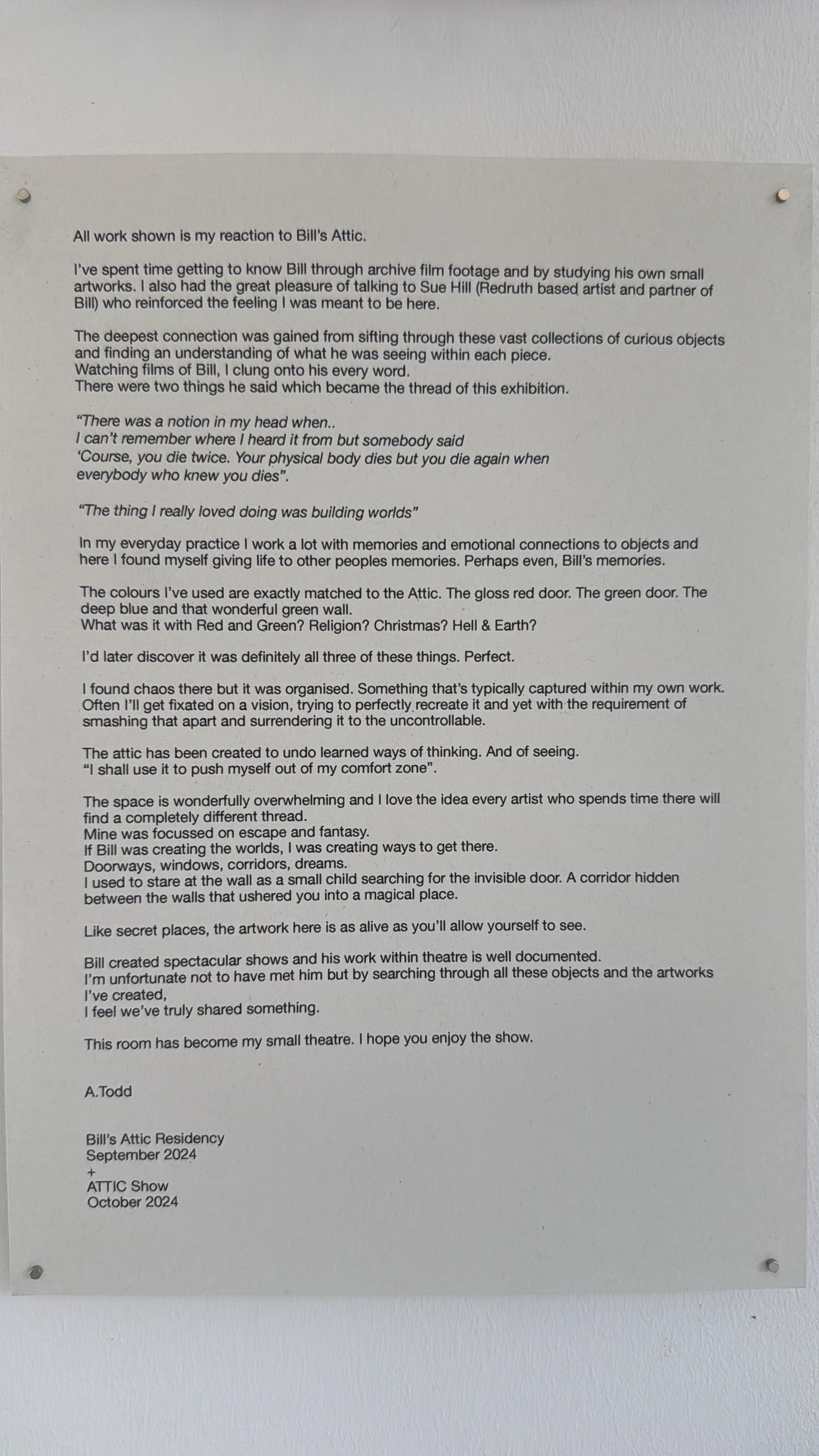 Film made during a month long residency at Bill's Attic. Shown as part of my solo 'Attic' show, October 2024